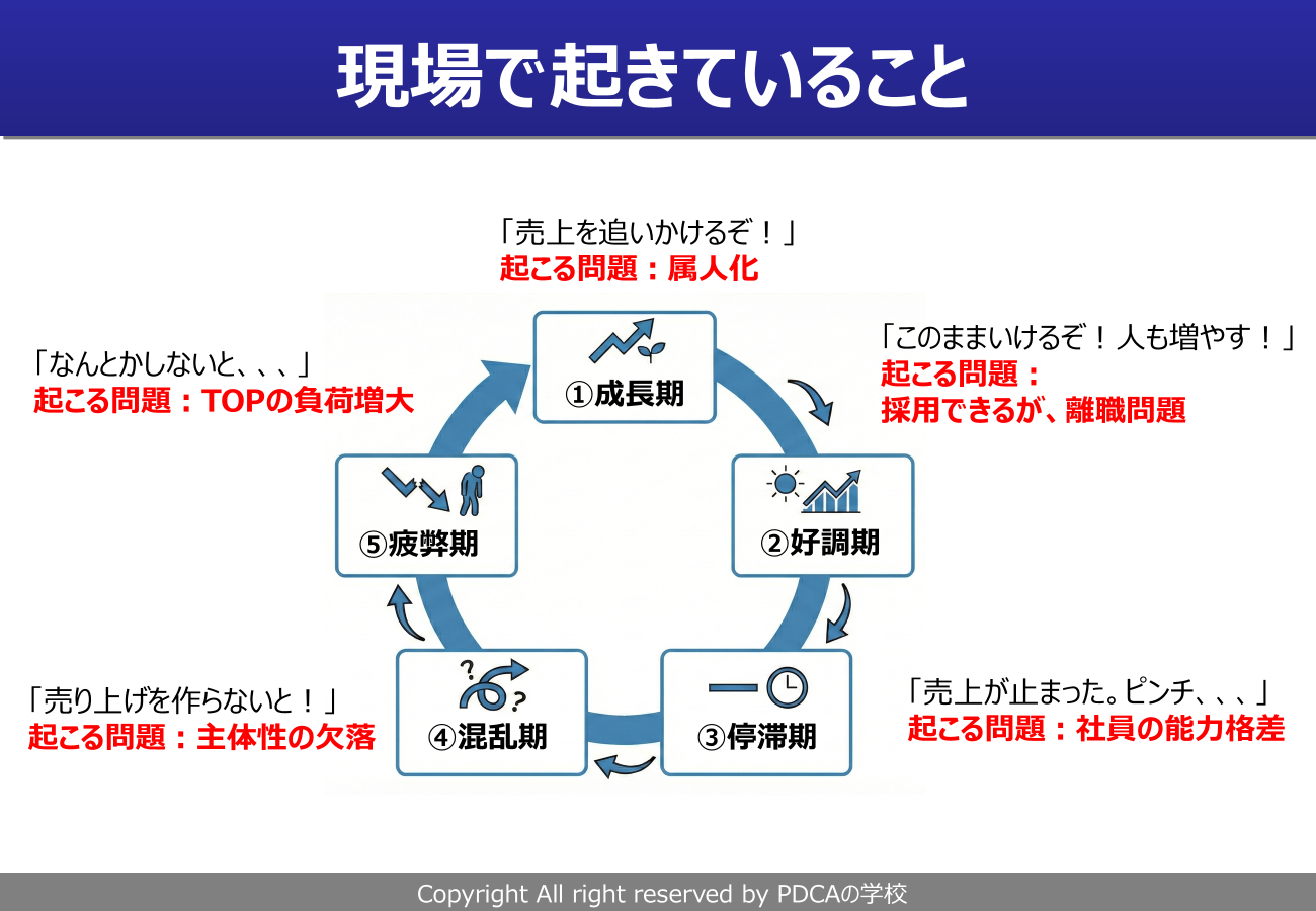 管理職に課題を問うと、必ず「忙しくて育成の時間が取れない」という答えが返ってきます。しかし、企業が暇になるのは業績が悪化した時だけです。忙しい時こそ、未来を作るための教育や仕組み作りに着手すべきなのです。